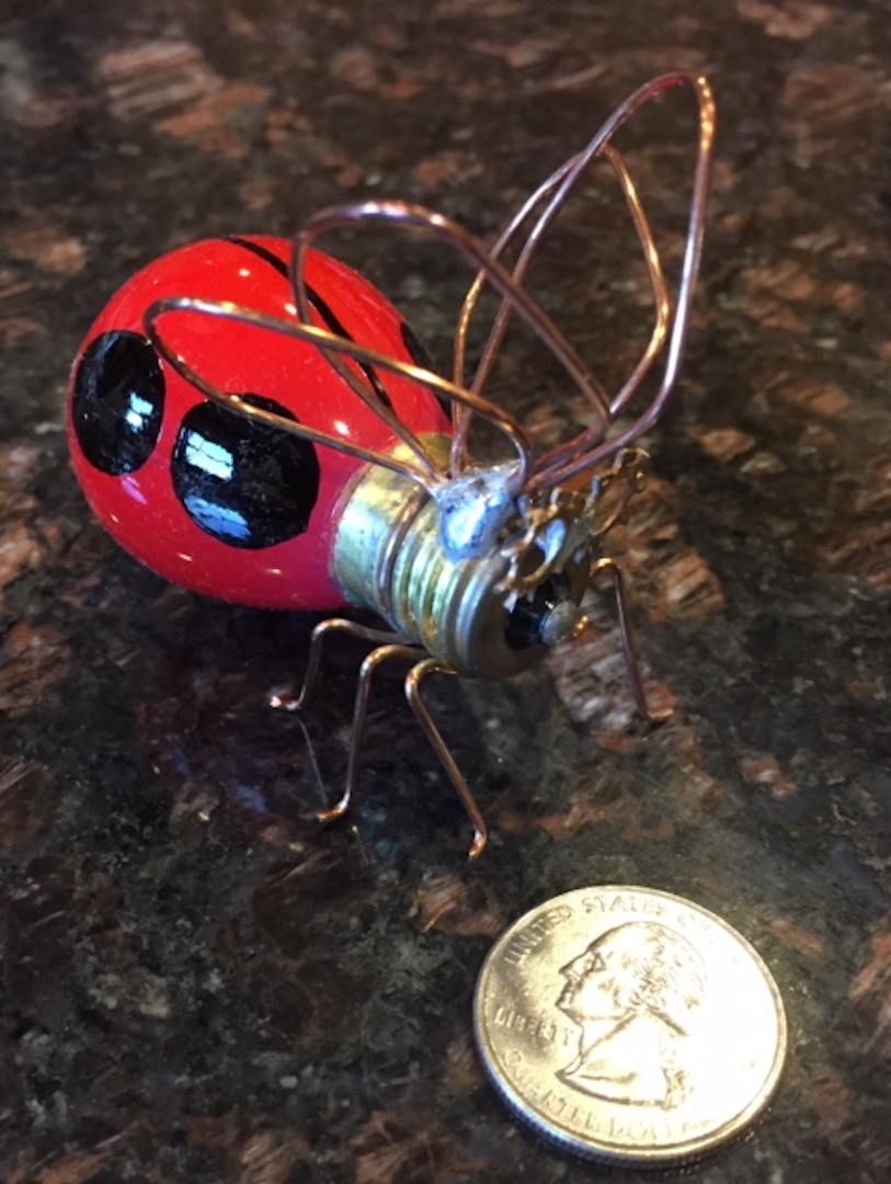 Add this little cutie to your windowsill or countertop. Also adorable in a fairy garden or hanging on your window screen. Individually handcrafted & unique, so spot pattern may vary. Made from an up-cycled lightbulb, copper wire and silicone bronze washers. Priced at $15 plus shipping & handling.